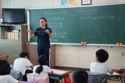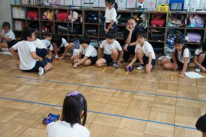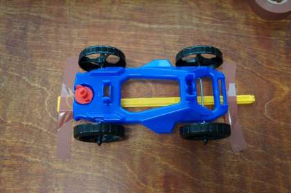 「風やゴムのはたらき」を学習しています。ゴムの力と車が走るきょりについて実験しました。