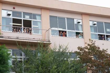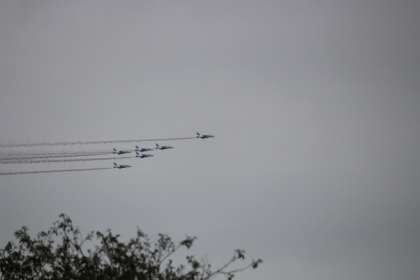 子ども祭りの前に3階の教室から航空ショーを見学しました。「わぁー」と子供たちの歓声があがりました。