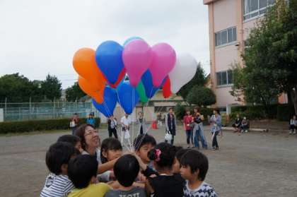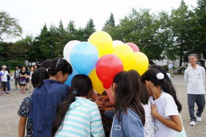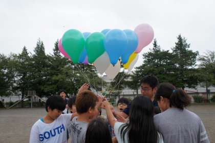 くもり空でしたが「風船とばし」を校庭にて行うことができました。