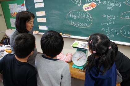 重さの学習をしています。秤を用いて重さを正しく測定できるようにしています。