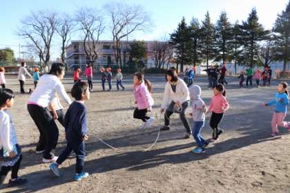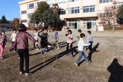 本日の児童集会は大なわ集会です。次々と跳び続ける1、2年生です。
