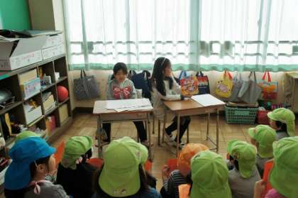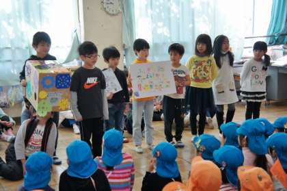 1、2年生が3園(長房中央・西・南保育園)の園児たちを招待して交流しました。クイズ迷路やけん玉、読み聞かせなどを楽しんでもらいました。
