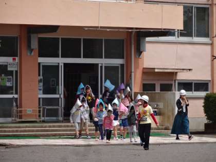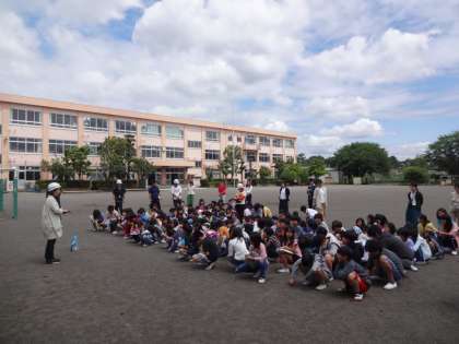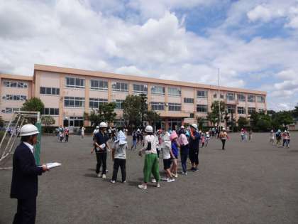 校庭への避難です。みんな静かに落ち着いて行動でています。集まってからもおしゃべりは一切ありません。