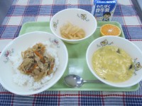 今日のこんだてはスタミナ丼中華風コーンスープ大根の風味漬け菊花みかん牛乳です。に...