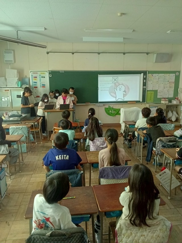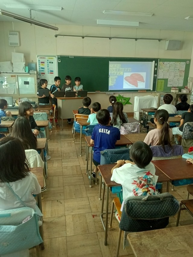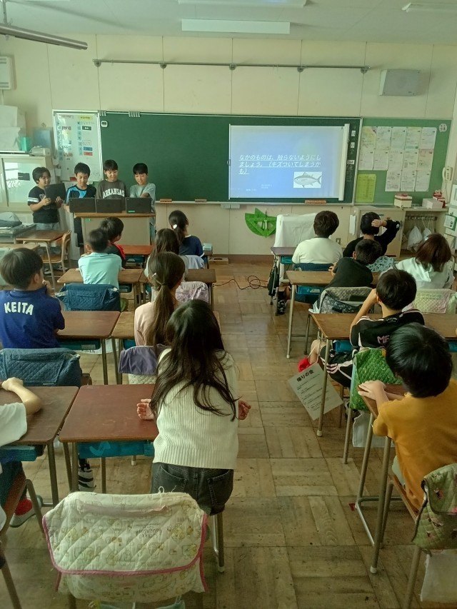 5年生が、9月に行った清水移動教室で学んだことをスライドにまとめ、4年生に向けて発表しました。