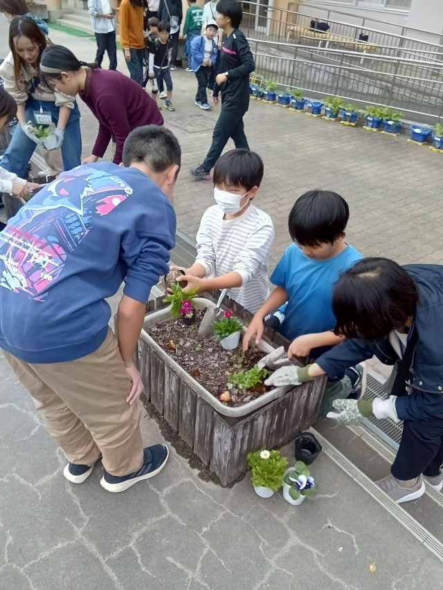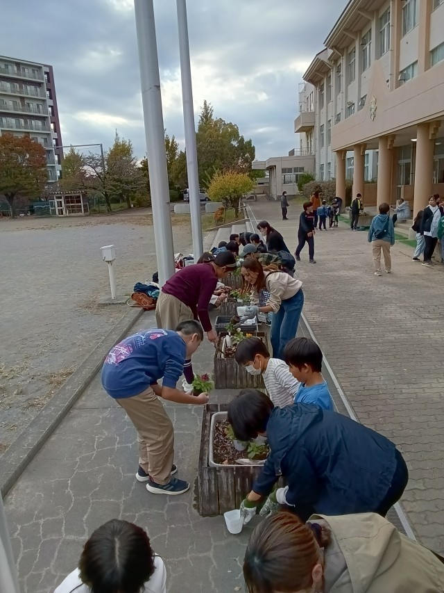 ながいけ会の保護者の皆さんと一緒に花壇に植えました。