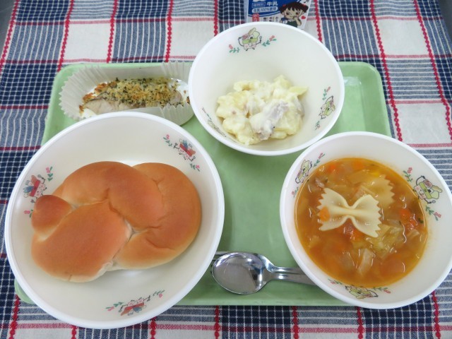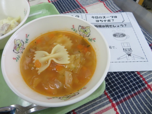 寒いこの季節には、トマトベースのスープにリボン型マカロニを入れたのが