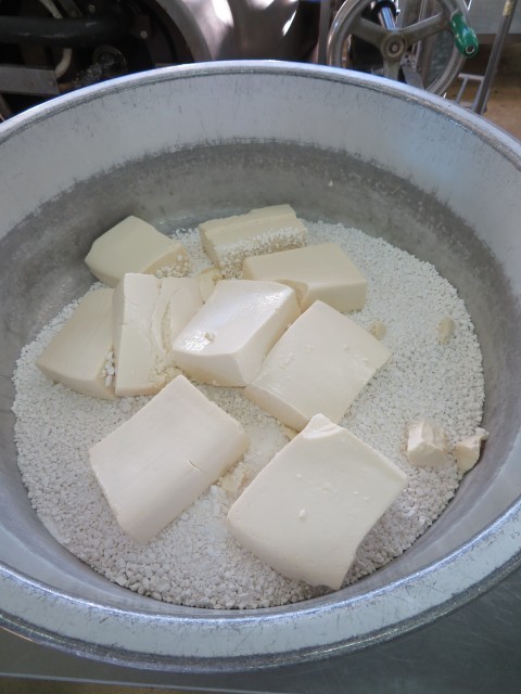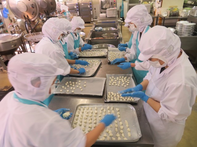 給食では、白玉粉に豆腐を加えて(水の代わりです)練ります。