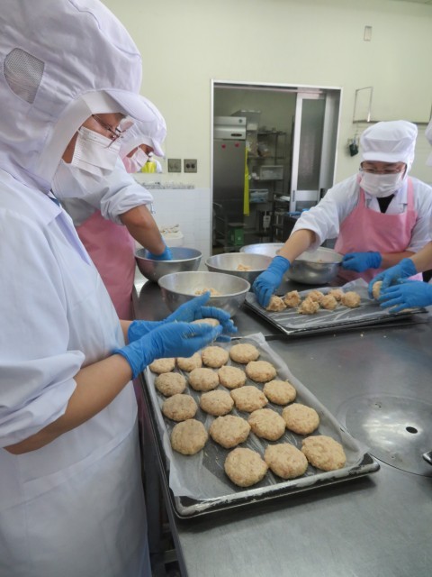 調理員さんが、一つ一つ小判型に丸めています。