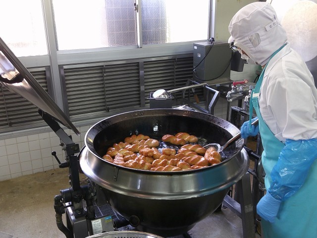人気のきなこ揚げパンは給食室で丁寧に揚げてきなこをまぶしています。