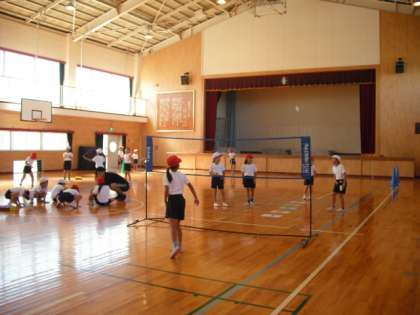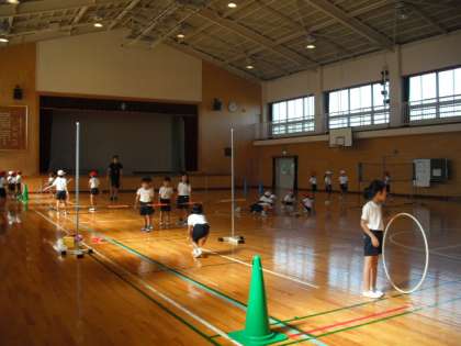 11日(金)の授業でも、フラフープやシャトル投げ、リンボーダンス、ジャ