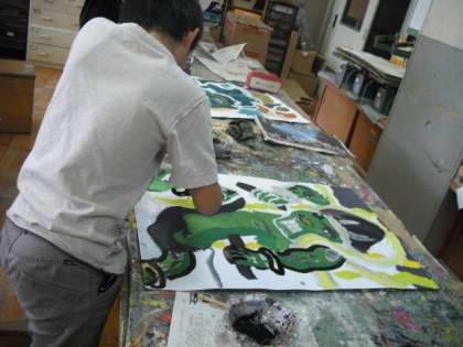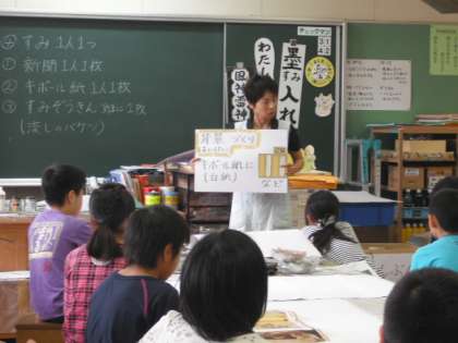 16日(水)の時間、5年生は、風神雷神の絵に墨入れをしていました。