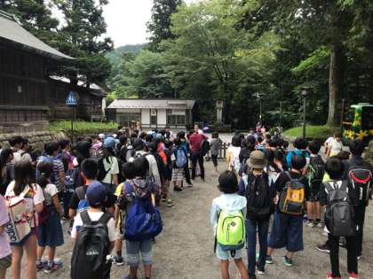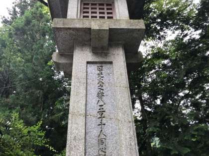 いよいよ二社一寺の見学です。まずは八王子市と日光市が姉妹都市である証拠の前でガイドさんの話を聞きます。みんな元気です。