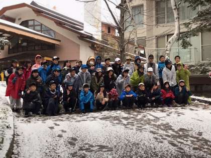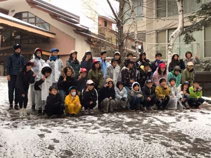 朝の会を終えて宿の前で雪景色の記念写真を撮りました。
