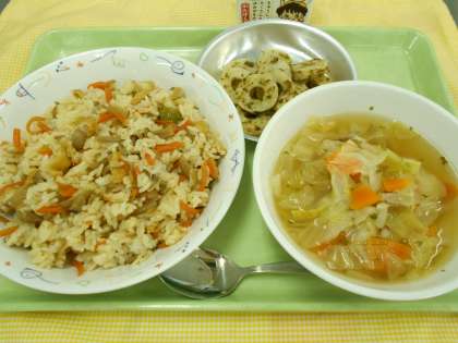 ちくわは「竹輪」と漢字で書くように、竹などの棒状のものに魚肉のすり身を巻き付けて、焼いたり蒸したりして作ります。きょうは、そのちくわを『マヨネーズ焼き』にしました。給食のマヨネーズ焼きは、マヨネーズ、生クリーム、かつお節粉、青のりを混ぜ合わせたソースを、ちくわにしっかりからめて焼きます。簡単な材料でさっと作れてしまうので、お弁当のおかずとしてもおすすめの一品です。きょうは、食べやすいように、ひとくちサイズの輪切りにしましたが、切り方は斜めでも乱切りでも舟形でも大丈夫です。ぜひ、お家でも作ってみてください。
