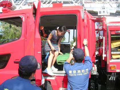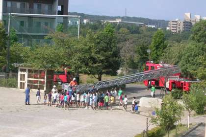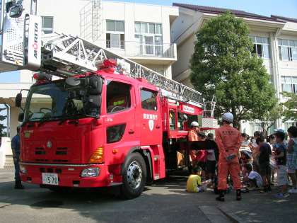 八王子消防署由木出張所より、消防自動車2台職員の方7名に来ていただき、実際に体験しながら学習しました。最後には「はしご車」も延ばしていただき、どこまで伸びるのかも見ることが出来ました。