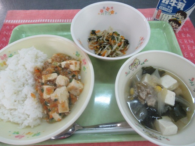 おとうふりょうりを2品な給食で提供しました。マーボーどうふとわかめ