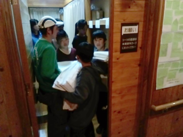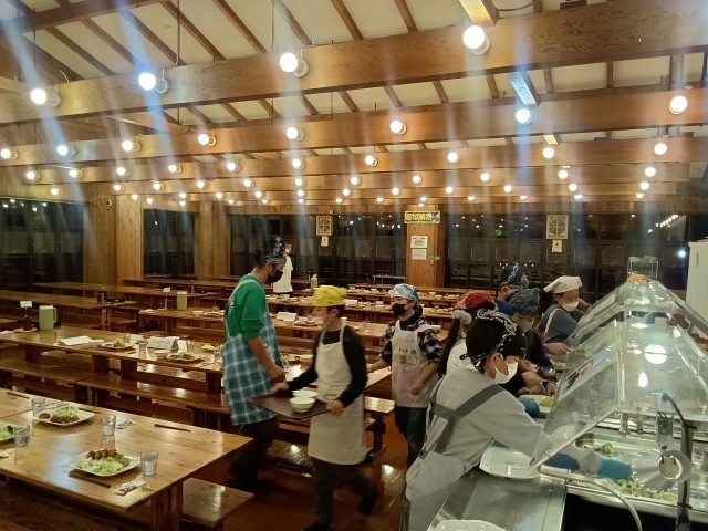 寝具係と食事係です。寝具係は、メンバーのシーツと枕カバーを部屋に運んでいます。食事係は、皆の夕食の配膳をしています。みんな、張り切って自分の仕事に取り組んでいました。