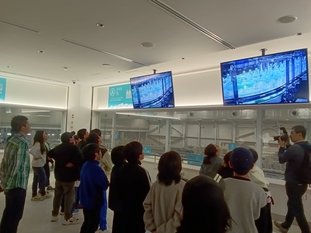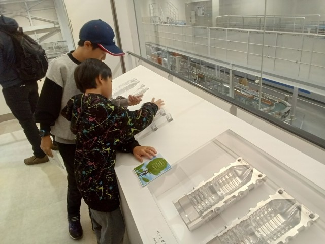 サントリーの工場見学です。天然水ができるまでを学びました。お土産に飲み物とクリアファイルをいただきました。