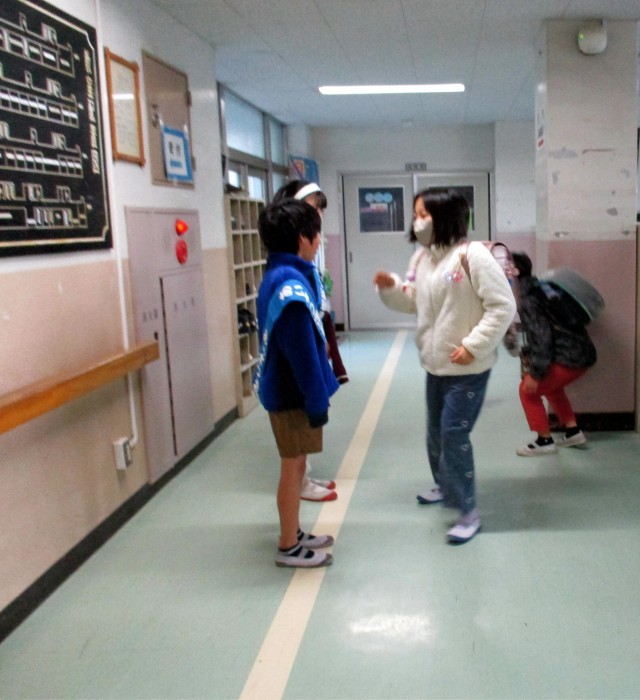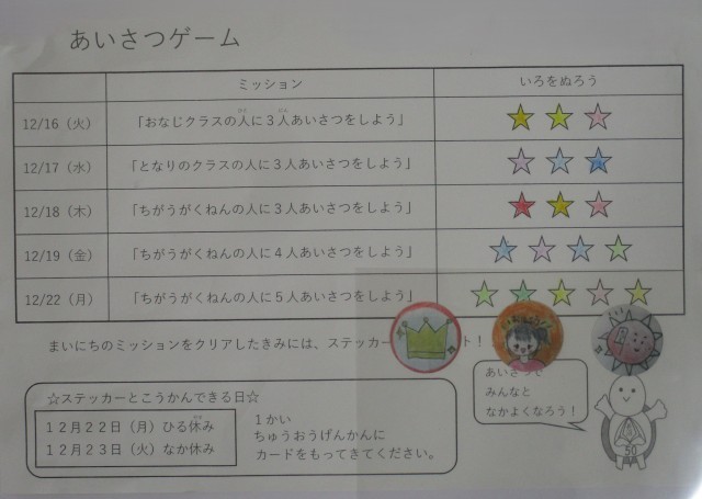 12月23日(火)代表委員会では、あいさつを増やすことで、もっと学校のみんなが仲良くなり、いじめを防止することができるのでさないかと考え、「あいさつゲーム」を企画し、実施しました。代表委員があいさつカードやゲームクリアをした人に配布するステッカーを作成しました。全校児童が積極的に参加し、元気なあいさつが交わされています。ステッカーも人気で、もらった人はとても嬉しそうでした。