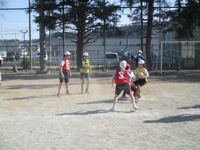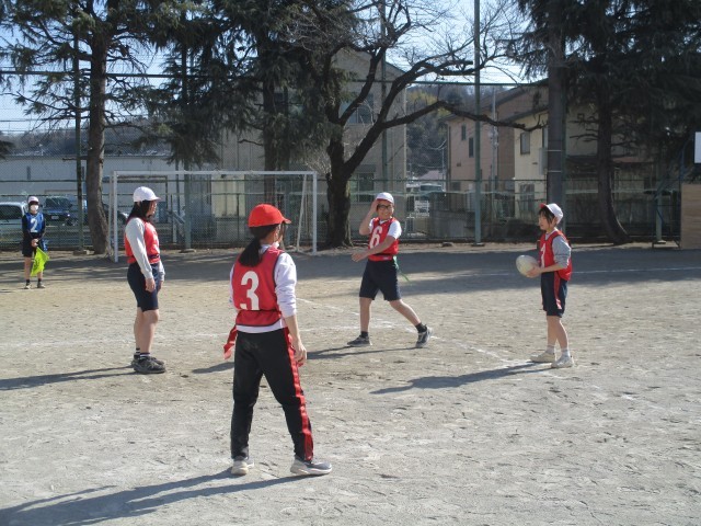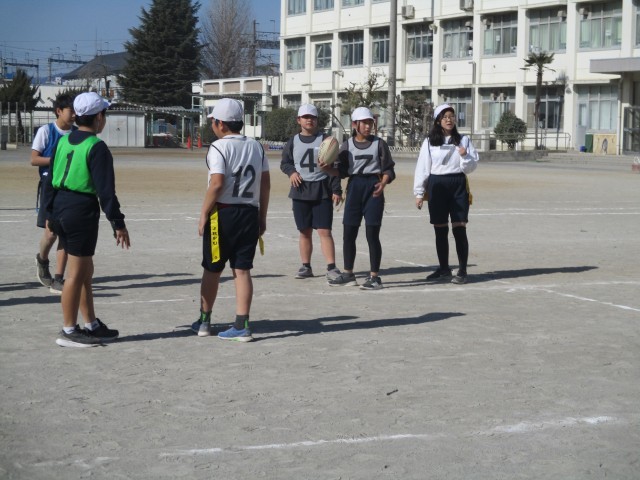 体育では、タグラグビーを学習しています。チームの仲間と協力したり、作戦を立てたりしながら取り組んでいます。