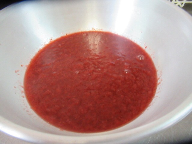 調理員さんがいちご、さとう、水、レモン果汁をあわせて