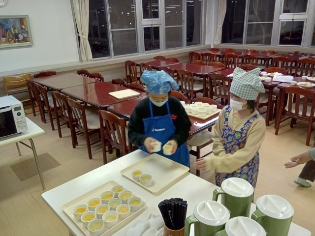 入浴後は夕食の準備です。食事係が頑張っています。