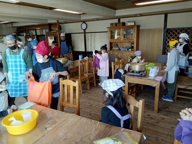ほうとう作りを始める前に、ほうとうの説明を聞きました。その後、手洗いをし、エプロン・三角巾を身に着け、いよいよほうとう作りのスタートです。