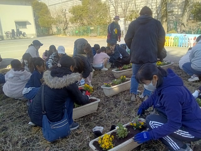 PTAガーデニングサークルの皆様を中心に、卒業式用植栽係の方々と参加の子供たちと一緒に、卒業式や入学式に渡り廊下を飾る花をプランターに植えました。当日の花道となり、卒業する児童や入学する児童をお祝いすることができると思います。中心となり動いていただいたPTAの皆様やご参加いただいた保護者の皆様や子供たち、学童保育所の皆様に感謝しています。お花を大事にしていきましょう。