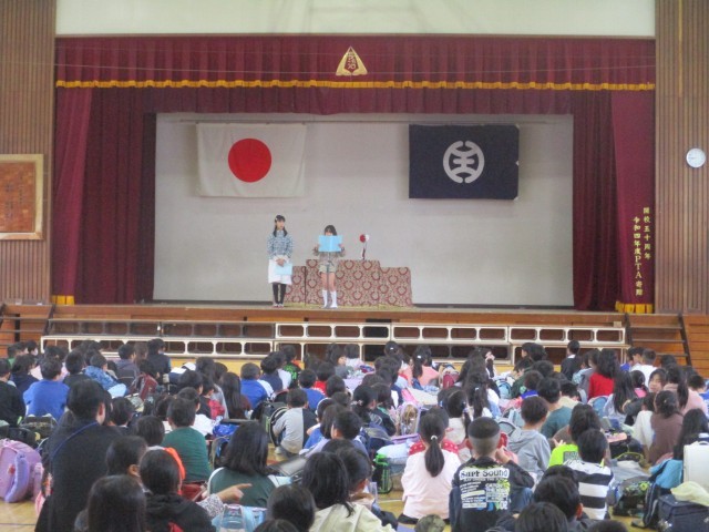 4/6に1学期始業式が行われました。クラスや先生が変わり、緊張や不安もあると思いますが、「この1年間を頑張ろう!」という気持ちが感じられる立派な表情や姿勢でした。6年生の代表児童が、作文を発表しました。みんなの手本になりたい、引っ張っていきたいという最高学年としての意気込みや、勉強や運動をがんばりたい、友達に優しくしたいなど、目標を堂々と発表しました。