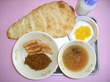 今日のパンは「ナン」といいます。インドなどの中近東で食べられているパンです。生地を発酵させてから、タンドゥールという釜の側面に貼り付けて焼き上げるのが特徴で、平たくて、所々がボコボコした独特の形をしています。今日は、パンを少しづつちぎってキーマカレーをのせ、インド風に食べてみましょう。
