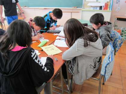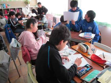 6年外国語活動「英語劇」 「ももたろう」の英語劇とペープサートに取り組んでいます。今日は、練習の後、劇とペープサートの道具作りをしていました。本番が楽しみです。