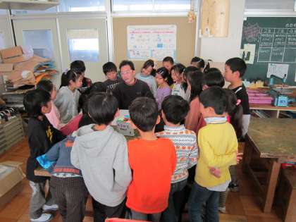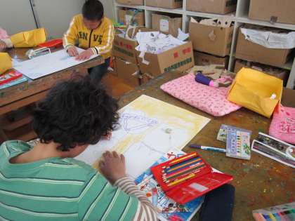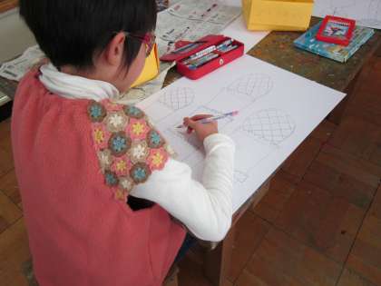 2年図画工作科「つくしのマンション」 でっかいつくしの中で生き物たちが春の準備をしている絵をかきます。想像しながら、楽しい絵を描き始めました。