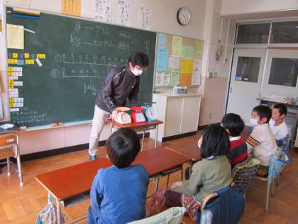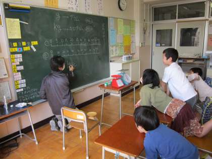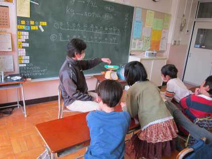 ひまわり学級算数科「重さ」 はかりを使って重さの学習です。gとkgの単位やメモリの読み方の学習をしていました。デジタルではなく、アナログの針を読むために、一メモリの重さの求め方を一生懸命学習していました