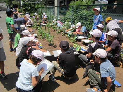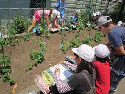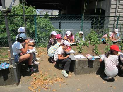 4年理科「ツルレイシ」 ツルレイシ(ゴーヤ)の観察をしました。大きくなったツルレイシをよく見ながら、細かいところまで観察できました。