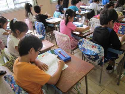 2年「カタカナで書く言葉」 カタカナで書く言葉を、1.外国から来た言葉 2 外国の国や土地の名前 3 動物のなき声 4いろいろなものの音 に分ける学習をしました。文章中の16個の言葉をよく考えながら、種類分けができました。