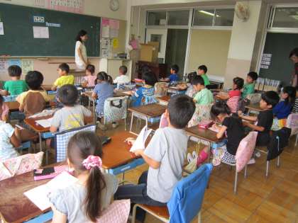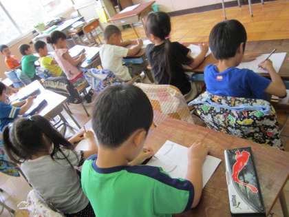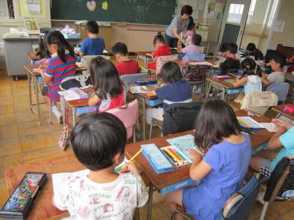 1年算数科「たしざん」 5になるたしざんの勉強です。あわせて、全部で、みんなでのキーワードの「がっちゃんたしざん」とふえるといくつがキーワードの「いれてねたしざん」を学習していました。たしざんの自作絵本をつくって、楽しく学習していました。