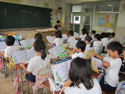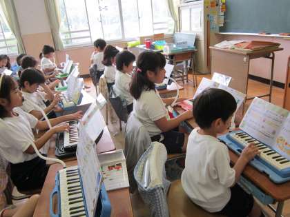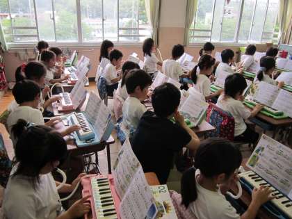 2年音楽科「山びこごっこ」「アンダルコのうた」 鍵盤ハーモニカの「ゆびひろげ」と「ゆびせばめ」の練習です。先生に一人一人チェックしてもらって、上手になっています。