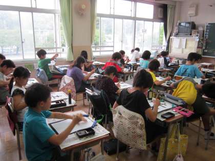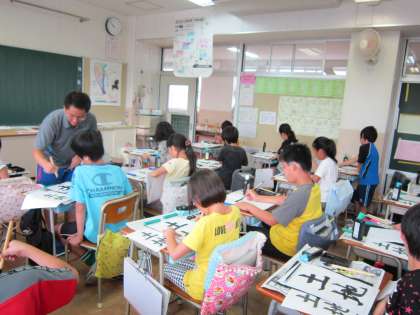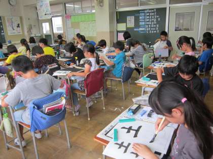 5年国語科「書写」 毛筆「土地」の学習です。筆を立てること、とめやはねに気をつけることなど、慎重に筆を動かしていました、