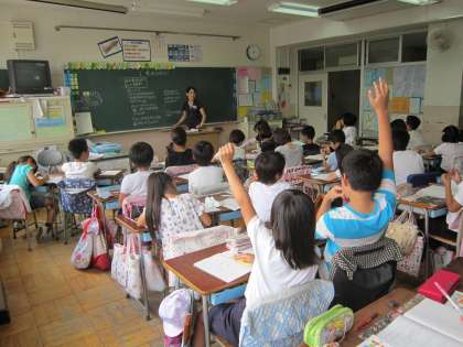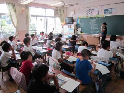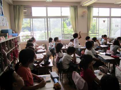 4年理科「電池のはたらき」 乾電池を使って、モーター(プロペラ)を回して気付いたことを話し合っていました。プロペラの回り方など、たくさん意見が出ていました。