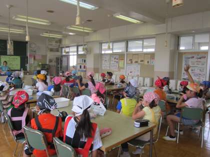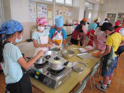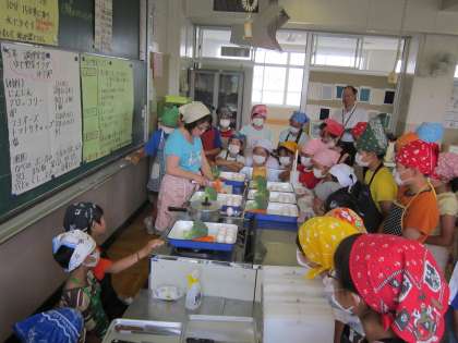 5年家庭科「調理実習」 ゆで野菜サラダとゆで卵を作りました。準備物や野菜の切り方の指導を受けて、グループで協力しながら楽しく実習をしていました。ゆで卵は、好みに合わせてゆで時間を調節していました。