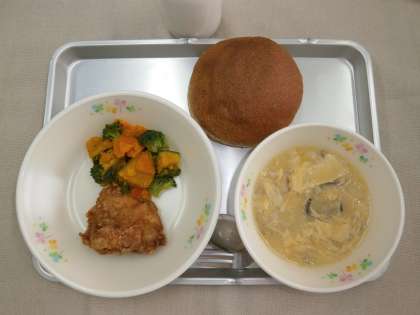 今日は、みんなの大好きな鶏肉の唐揚げです。鶏肉は、牛肉や豚肉などと比べて、味がやさしく食べやすいお肉です。また、他のお肉に比べて良質なたんぱく質が多く、ビタミンAが豊富なのも特徴です。筋肉をつけたり、体力の回復にもってこいの食品です。今日は、パンにはさんでチキンバーガーにして食べてもおいしいですね。