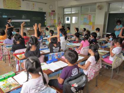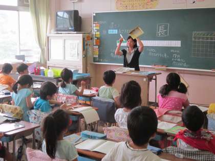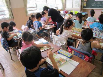 2年算数科「長さ」 身の回りの物の長さを確かめます。方眼紙でできた定規を持って、何マス分の長さかを調べていました。