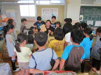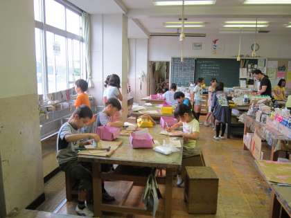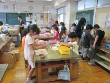 4年図画工作科「あそびチックランド」 さしこみときりぬきを使っての工作もいよいよ仕上げに近い段階に入りました。細かい作業ですが、集中して一生懸命に取り組んでいました。