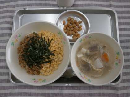 ぶどう豆とは、煮豆のことをいいます。「ぶどうの粒のように、ふっくらと煮た豆」という意味から、この名前がつけられています。給食では黄大豆で作りましたが、黒豆で作るのが一般的だそうです。黒豆の黒い煮汁を何度も何度も煮こぼして、黒い色が赤紫色になるまでさらして作ります。豆は苦手な人も多いようですが、とてもおいしく煮えたので一粒でも食べてみましょう。