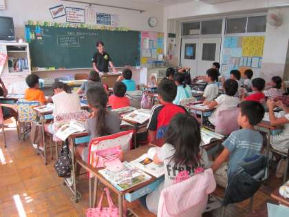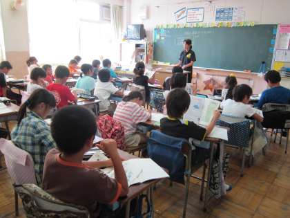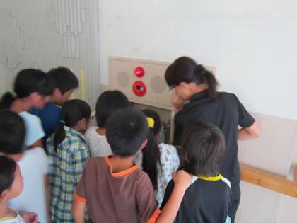 4年社会科「学校の消防せつびを探そう」 消火栓、煙探知機、熱探知機、消火器、非常放送設備などについて、学習資料で知り、実際の設備を見学しました。