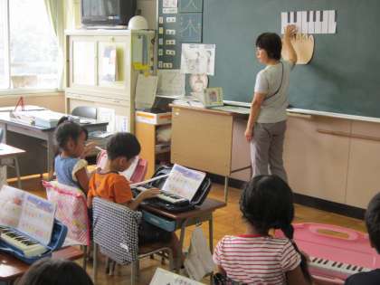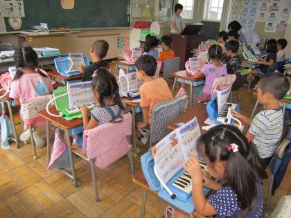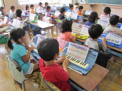 1年音楽科「ドレミでふこう」「つきよ」 鍵盤ハーモニカで指使いにとタンギングに注意しながら楽しく演奏しました。