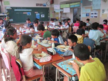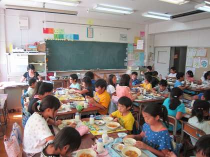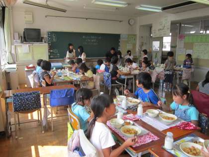 たてわり班の教室に1年生から6年生までが集まって、給食を食べました。いつもと違う雰囲気の中学年の違う子同士で、楽しそうに食べていました。