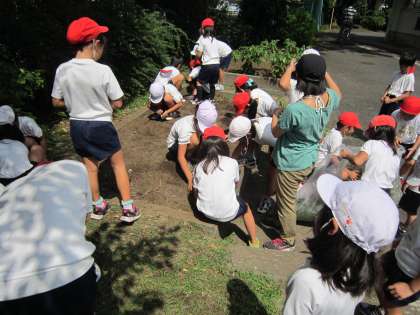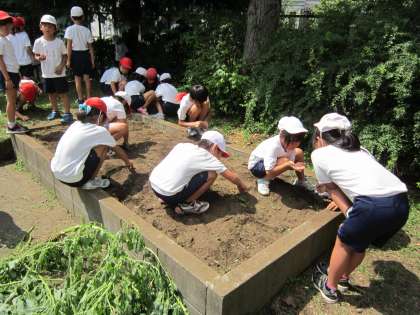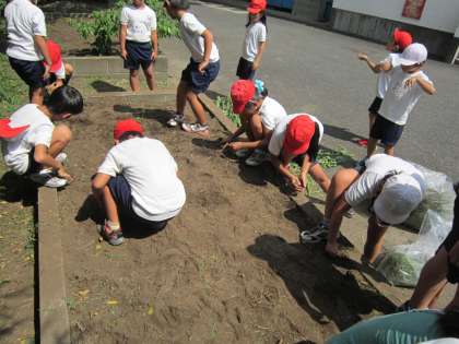 2年生活科「はつか大根を育てよう」 はつか大根の種まきの前に、花壇の草取りを、みんなで汗を流しながらがんばっていました。