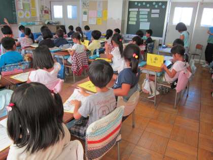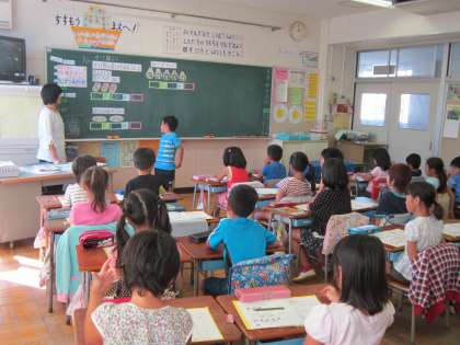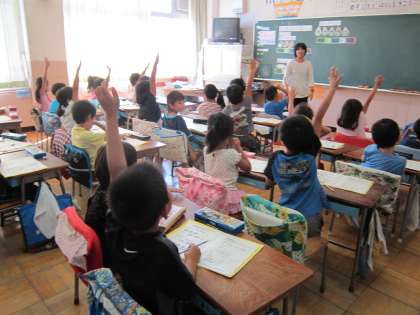 2年算数科「かけ算」 かけ算の意味について考える授業です。1つ分の数×いくつ分=全部の数、かけ算の式のたて方をしっかり学習していました。